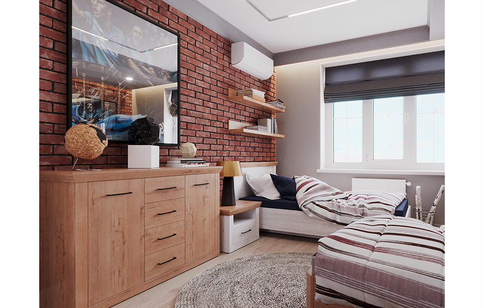 - Молодежная будет гармонировать как с классическими оттенками белого, серого, коричневого, так и с текстурами — деревом, бетоном и кирпичом;